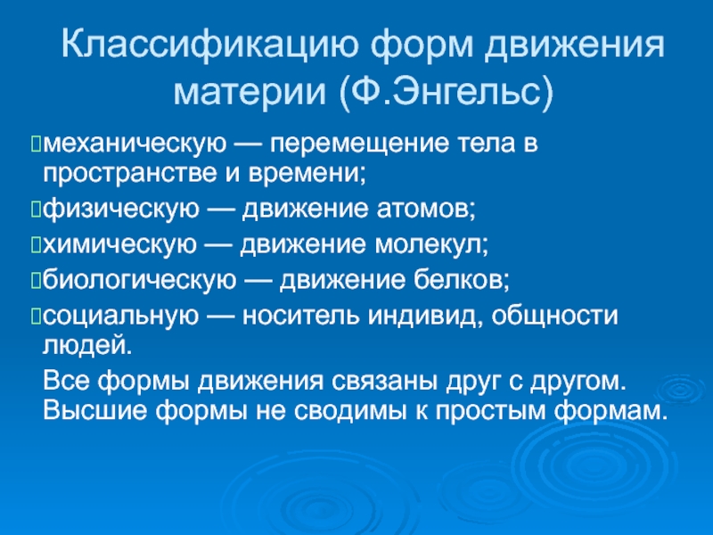 Слайд 40Классификацию форм движения материи (Ф.Энгельс)