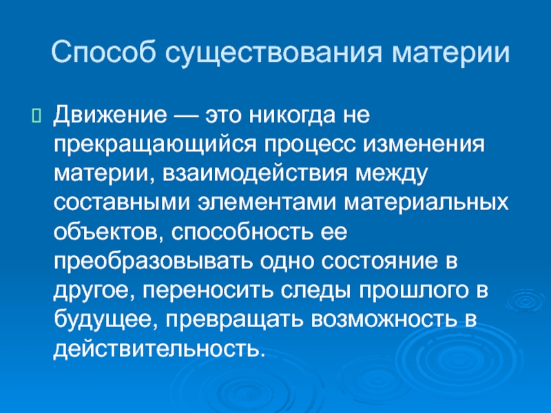 изменения материи, взаимодействия между составными элементами материальных объектов, способность ее