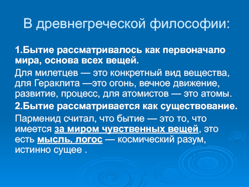 1.Бытие рассматривалось как первоначало мира, основа всех
