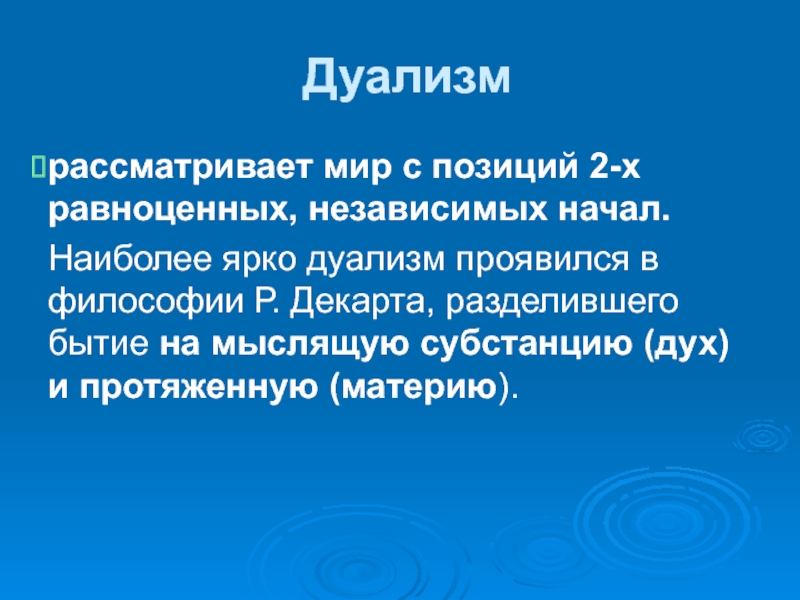 рассматривает мир с позиций 2-х равноценных, независимых начал.