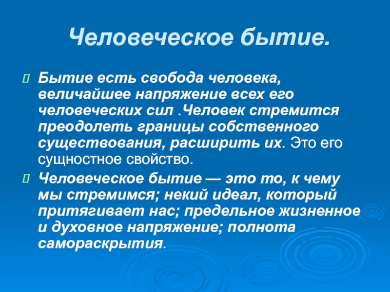 Человеческое бытие — это то, к чему мы стремимся; некий идеал, который притягивает нас; предельное жизненное и духовное напряжение; полнота самораскрытия.