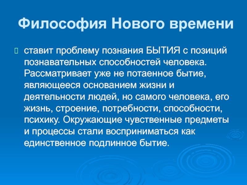и деятельности людей, но самого человека, его жизнь, строение, потребности, способности, психику. Окружающие чувственные предметы и процессы стали восприниматься как единственное подлинное бытие.
