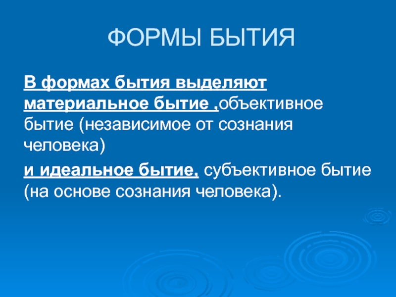 В формах бытия выделяют материальное бытие ,объективное бытие (независимое