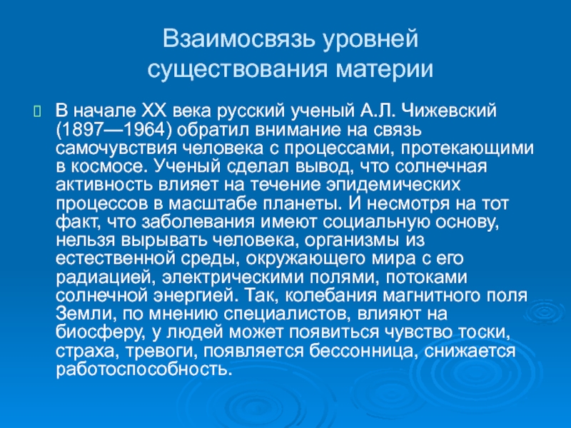 процессами, протекающими в космосе. Ученый сделал вывод, что солнечная активность влияет на течение эпидемических процессов в масштабе планеты. И несмотря на тот факт, что заболевания имеют социальную основу, нельзя вырывать человека, организмы из естественной среды, окружающего мира с его радиацией, электрическими полями, потоками солнечной энергией. Так, колебания магнитного поля Земли, по мнению специалистов, влияют на биосферу, у людей может появиться чувство тоски, страха, тревоги, появляется бессонница, снижается работоспособность.