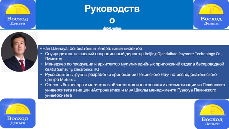 управлять высокими технологиями соединяя такие технологии как Big Data с искусственным интеллектом (далее ИИ) в области финансов. Группа управляет шестью бизнес-сегментами: Управление благосостоянием, потребительское кредитование, кредитоване в рассрочку, цифровые финансы, финансовый супермаркет, быстрые займы С полным охватом всей Fintech-сети, которая также управляет десятком бизнес-платформ, Чжан Е Кредит, Чжан Торговый Центр, ДанаРупия (Индонезия), Идонг (Вьетнам), Пондопесо (Филиппины) и ООО «Восход Консальтинг» (Россия)Основные возможности Fintech: