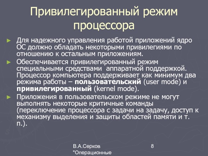 Обеспечивается привилегированный режим специальными средствами аппаратной поддержкой. Процессор компьютера поддерживает как минимум два режима работы – пользовательский (user mode) и привилегированный (kernel mode).