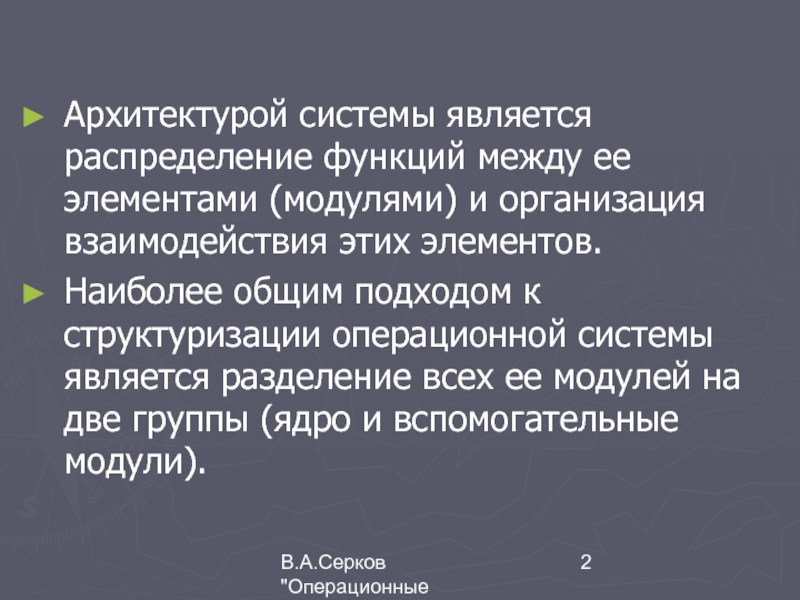 структуризации операционной системы является разделение всех ее модулей на две группы (ядро и вспомогательные модули).