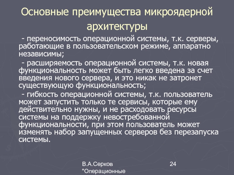 операционной системы, т.к. новая функциональность может быть легко введена за счет введения нового сервера, и это никак не затронет существующую функциональность;