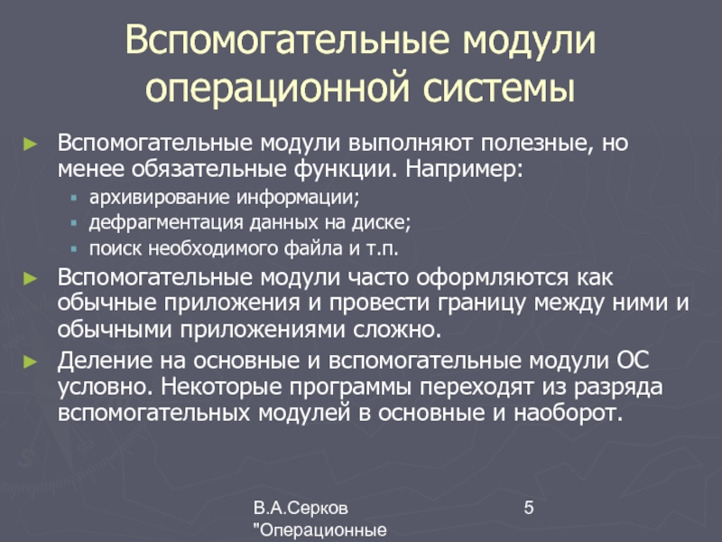 Деление на основные и вспомогательные модули ОС условно. Некоторые программы переходят из разряда вспомогательных модулей в основные и наоборот.