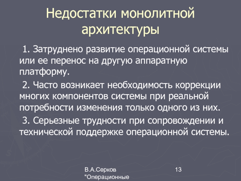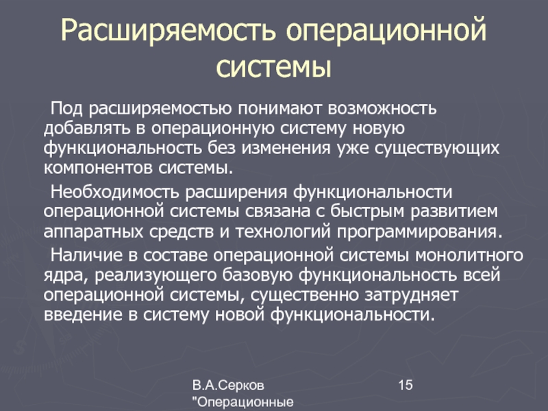 Наличие в составе операционной системы монолитного ядра, реализующего базовую функциональность всей операционной системы, существенно затрудняет введение в систему новой функциональности.