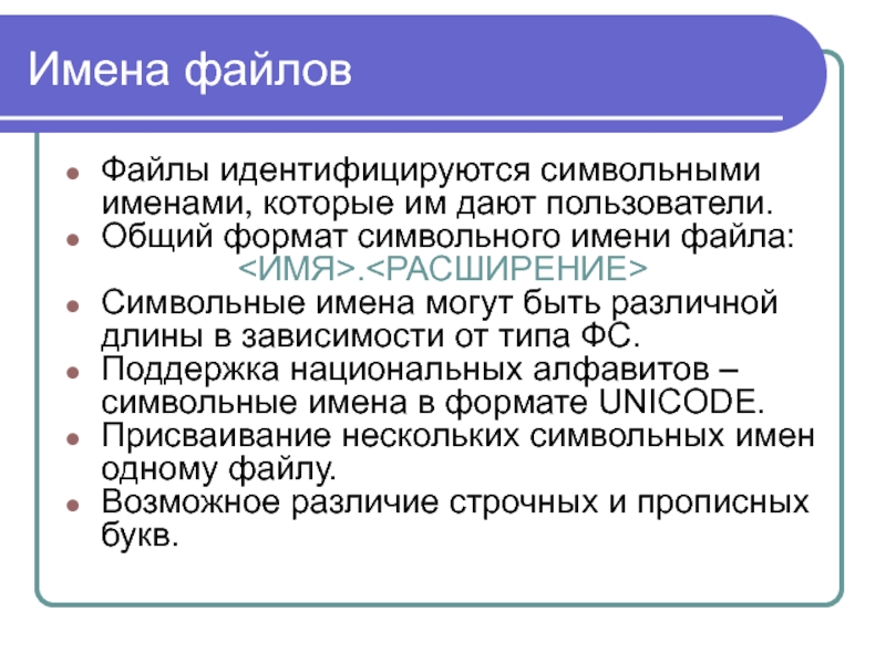 Файлы идентифицируются символьными именами, которые им дают пользователи.