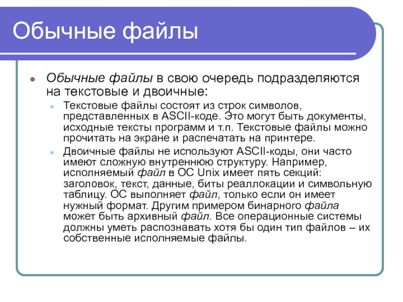 Обычные файлы в свою очередь подразделяются на текстовые и