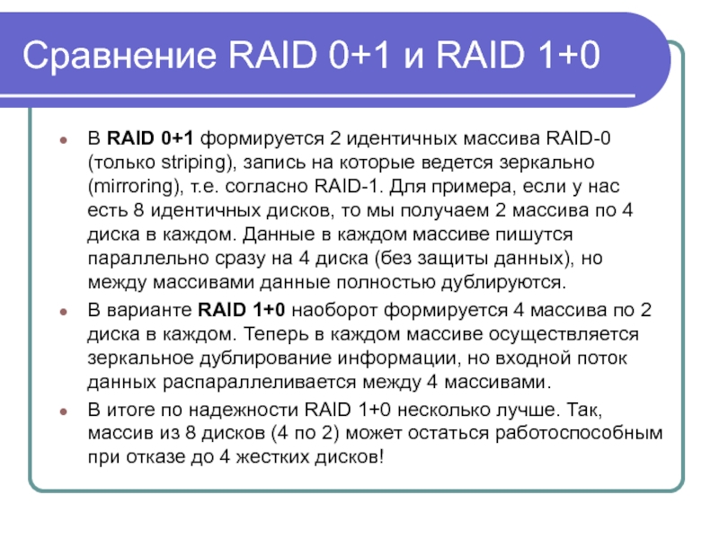 Слайд 53Сравнение RAID 0+1 и RAID 1+0