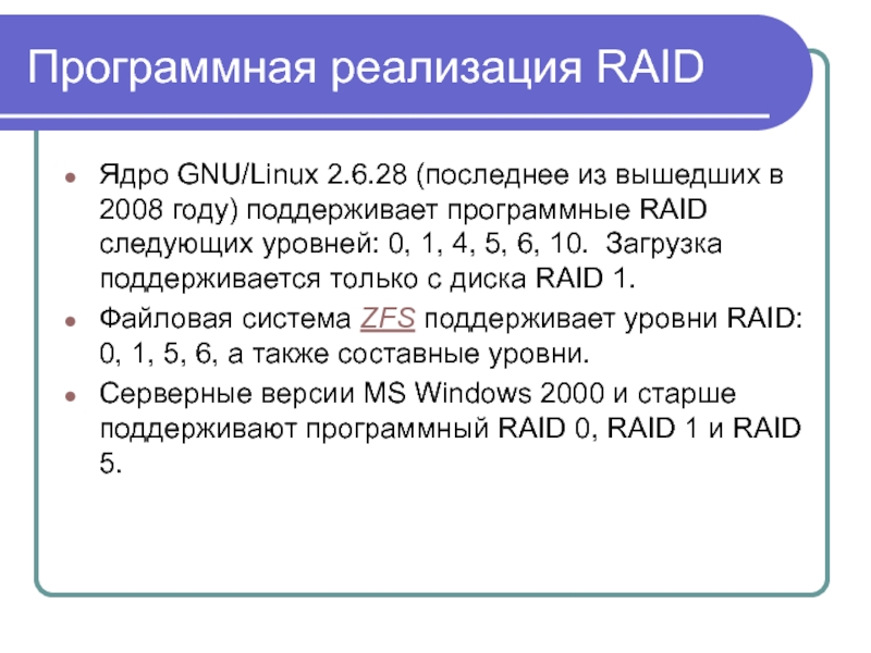 Программно обычно реализуют простые уровни RAID - 0 и 1, так как они не требуют значительных вычислений.