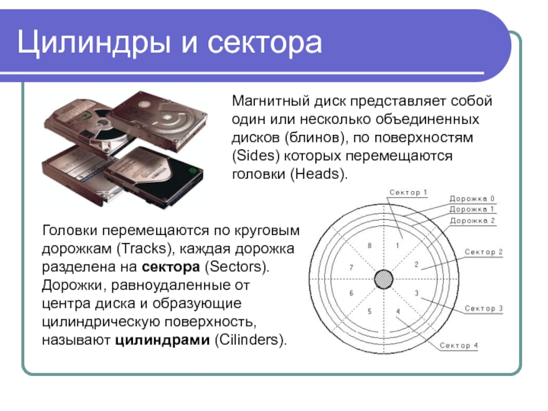 Магнитный диск представляет собой один или несколько объединенных дисков (блинов), по поверхностям (Sides) которых перемещаются головки (Heads).