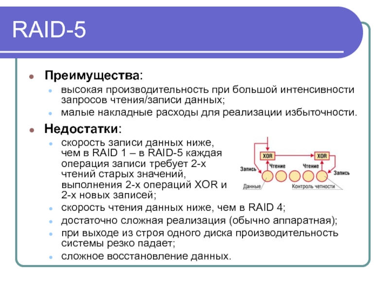 чем в RAID 1 – в RAID-5 каждая операция записи требует 2-х чтений старых значений, выполнения 2-х операций XOR и 2-х новых записей;