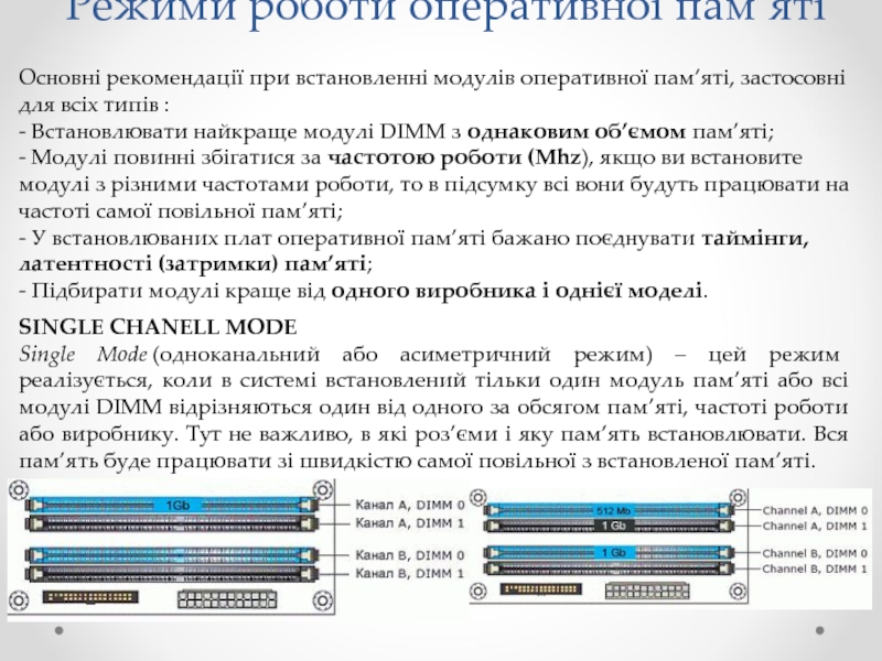 Single Mode (одноканальний або асиметричний режим) – цей режим реалізується, коли в системі встановлений тільки один модуль пам’яті або всі модулі DIMM відрізняються один від одного за обсягом пам’яті, частоті роботи або виробнику. Тут не важливо, в які роз’єми і яку пам’ять встановлювати. Вся пам’ять буде працювати зі швидкістю самої повільної з встановленої пам’яті.