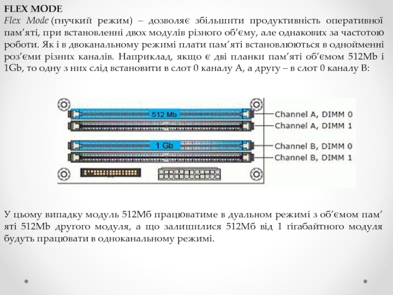 У цьому випадку модуль 512Мб працюватиме в дуальном режимі з об’ємом пам’яті 512Mb другого модуля, а що залишилися 512Мб від 1 гігабайтного модуля будуть працювати в одноканальному режимі.