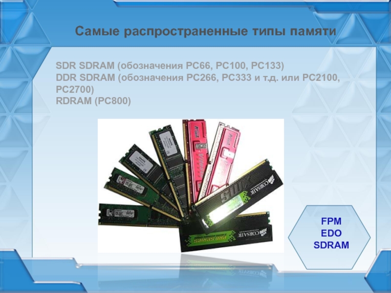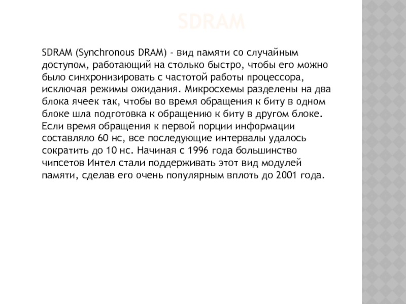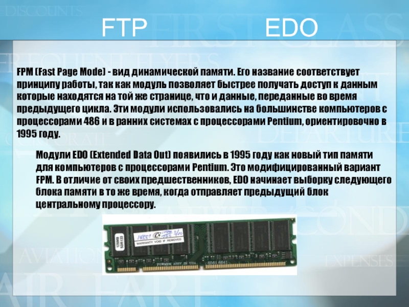 быстрее получать доступ к данным которые находятся на той же странице, что и данные, переданные во время предыдущего цикла. Эти модули использовались на большинстве компьютеров с процессорами 486 и в ранних системах с процессорами Pentium, ориентировочно в 1995 году.