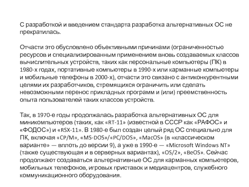 Слайд 36С разработкой и введением стандарта разработка альтернативных ОС не прекратилась.