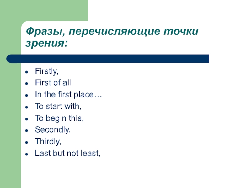 Фразы, перечисляющие точки зрения:Firstly,First of allIn the first place…To start with,To begin this,Secondly,Thirdly,Last but not least,