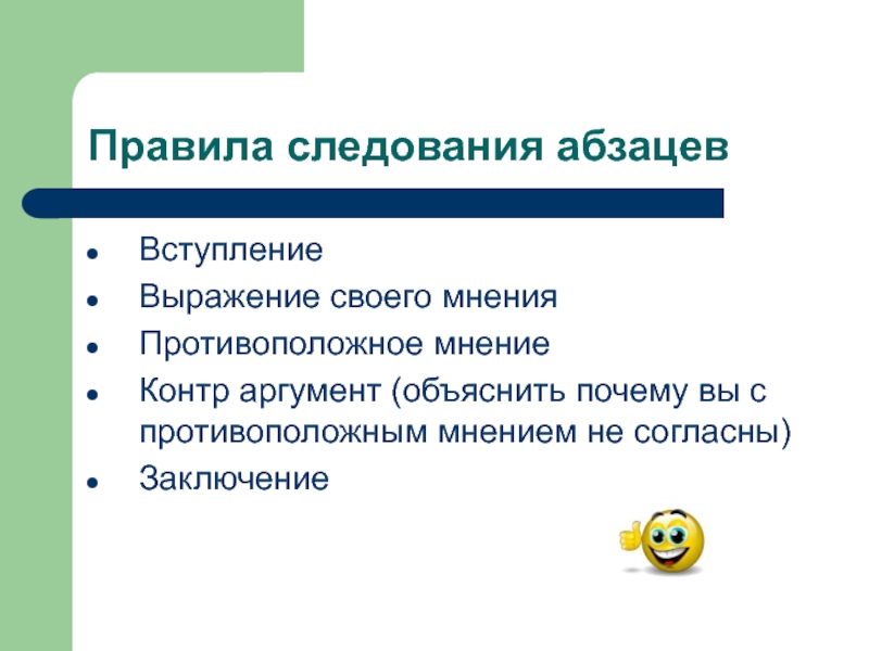 Правила следования абзацевВступлениеВыражение своего мненияПротивоположное мнениеКонтр аргумент (объяснить почему вы с противоположным мнением не согласны)Заключение
