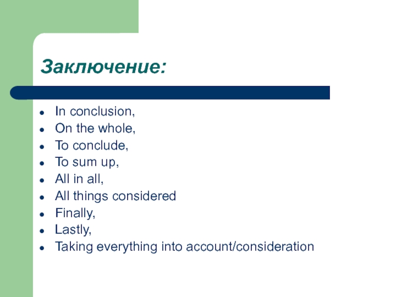Заключение:In conclusion,On the whole,To conclude,To sum up,All in all,All things consideredFinally,Lastly,Taking everything into account/consideration