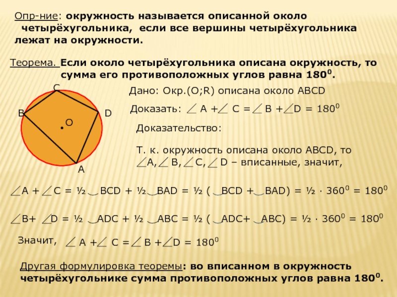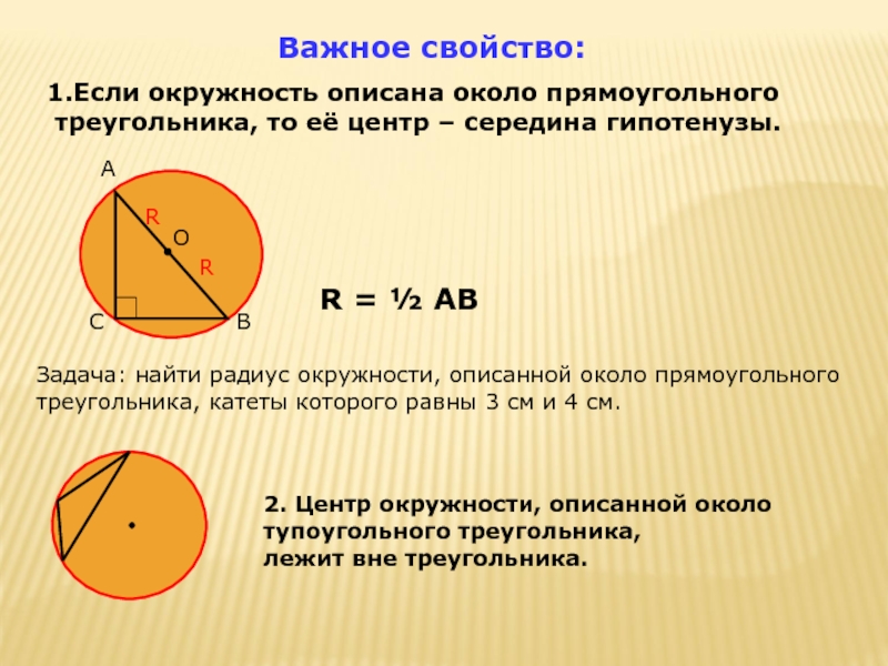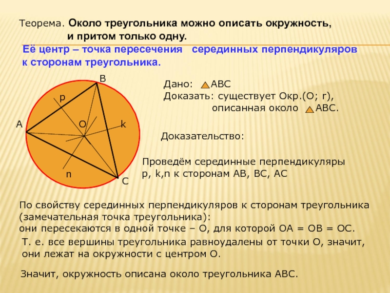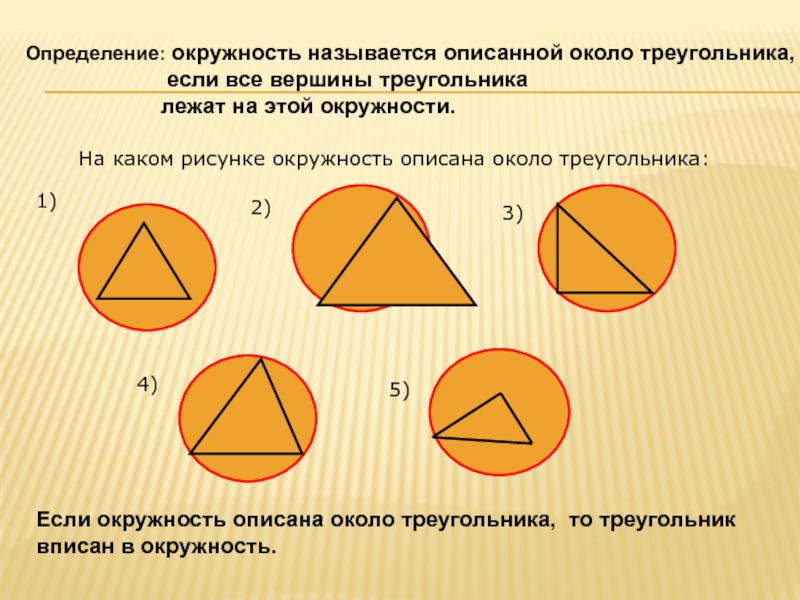 Если окружность описана около треугольника, то треугольник вписан в окружность.