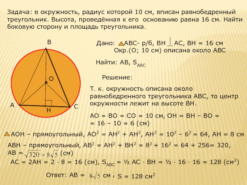 АС = 2АН = 2 · 8 = 16 (см), SАВС = ½ АС · ВН = ½ · 16 · 16 = 128 (см2)