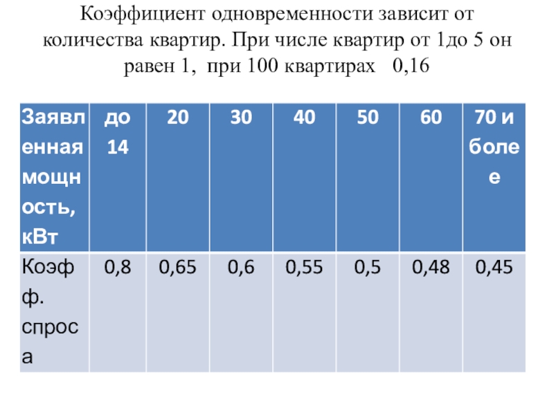 Слайд 16Коэффициент одновременности зависит от количества квартир. При числе квартир от