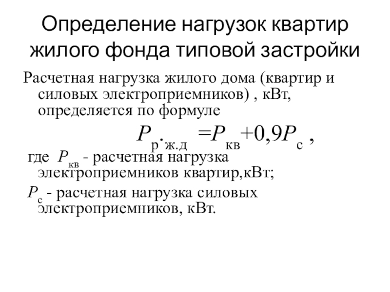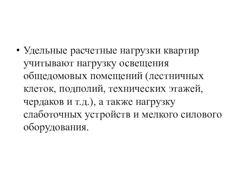 Слайд 7Удельные расчетные нагрузки квартир учитывают нагрузку освещения общедомовых помещений (лестничных