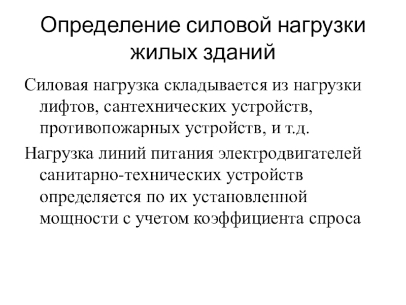 Слайд 17Силовая нагрузка складывается из нагрузки лифтов, сантехнических устройств, противопожарных устройств,