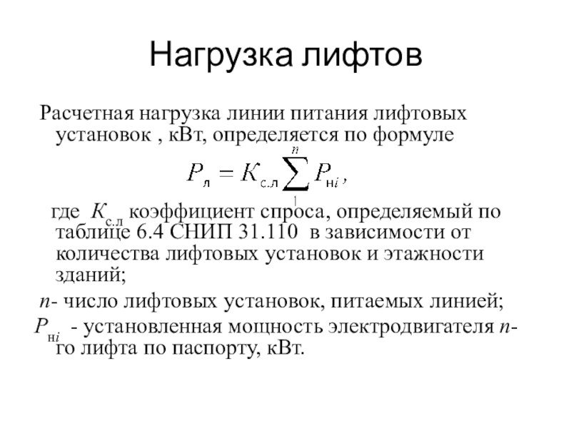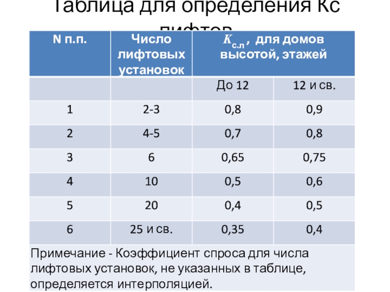 где Кс.л коэффициент спроса, определяемый по таблице 6.4 СНИП 31.110 в зависимости от количества лифтовых установок и этажности зданий;