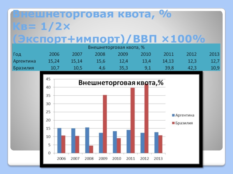 Слайд 6Внешнеторговая квота, % Кв= 1/2×(Экспорт+импорт)/ВВП ×100%