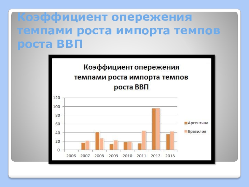 коэффициент опережения темпами роста импорта темпов роста ВВП этих стран говорит о том, что Аргентина и Бразилия до 2011 года имели среднюю включенность в МРТ и высокую в 2012 году
