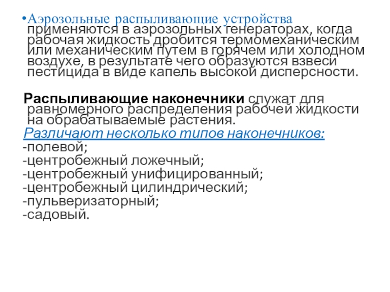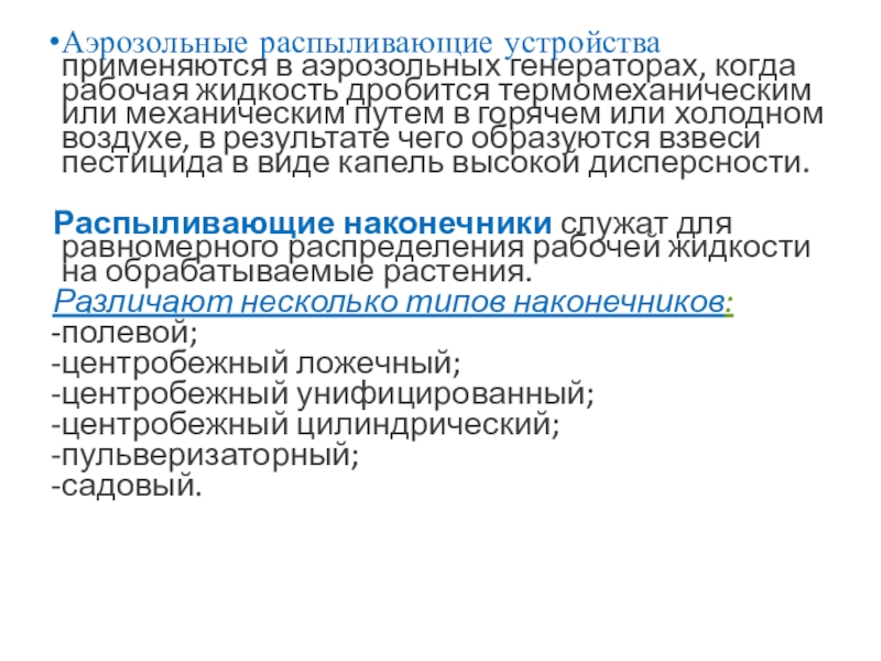 Слайд 10Аэрозольные распыливающие устройства применяются в аэрозольных генераторах, когда рабочая жидкость