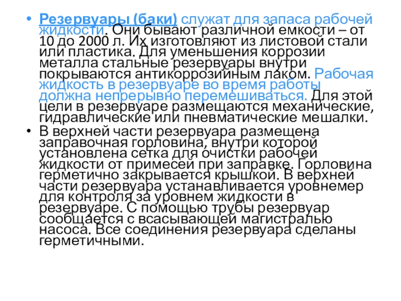 Слайд 8Резервуары (баки) служат для запаса рабочей жидкости. Они бывают различной