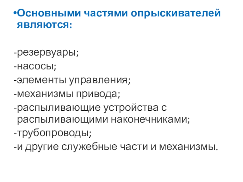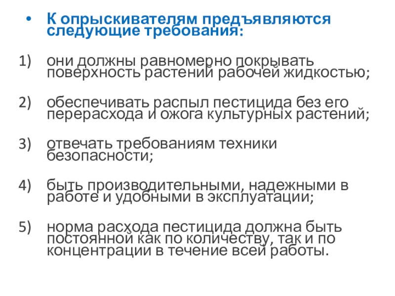 Слайд 5К опрыскивателям предъявляются следующие требования: