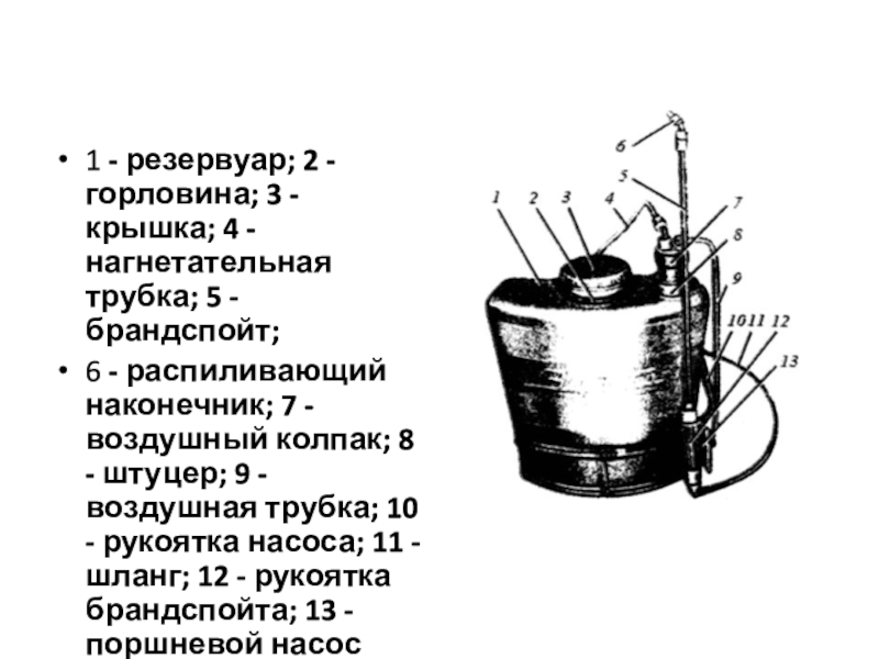 колпак; 8 - штуцер; 9 - воздушная трубка; 10 - рукоятка насоса; 11 - шланг; 12 - рукоятка брандспойта; 13 - поршневой насос