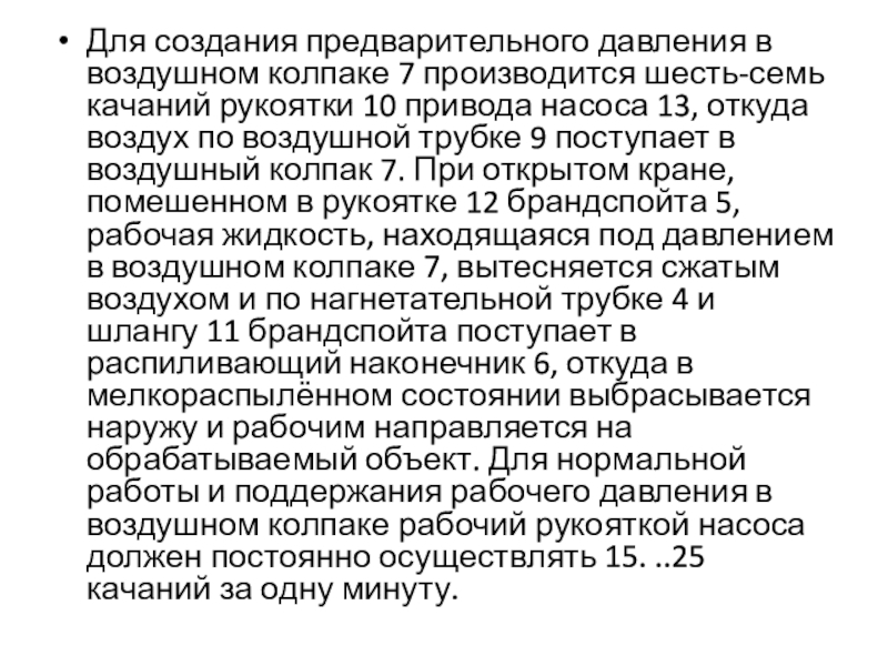 Слайд 17Для создания предварительного давления в воздушном колпаке 7 производится шесть-семь