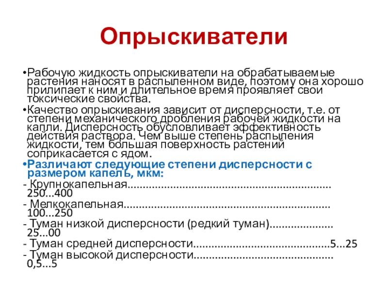 Качество опрыскивания зависит от дисперсности, т.е. от степени механического дробления рабочей жидкости на капли. Дисперсность обусловливает эффективность действия раствора. Чем выше степень распыления жидкости, тем большая поверхность растений соприкасается с ядом.