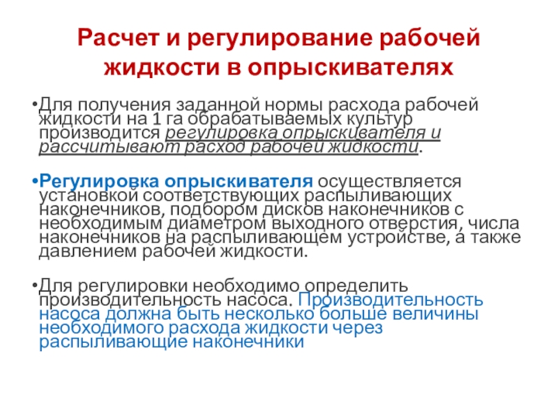Слайд 13Расчет и регулирование рабочей жидкости в опрыскивателях
