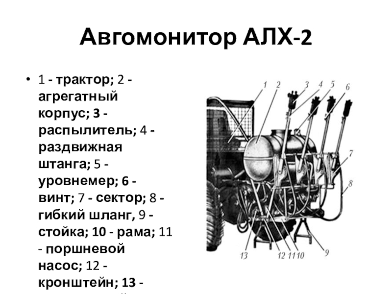 Опрыскиватель состоит из рамы 3, бака 2, насоса 5, распиливающего устройства, состоящего из центральной 11 и двух боковых секций 9 со штангами 10 и распылителями 8, пульта управления 13, заправочного рукава 12. Центральная секция при обработке виноградников монтируется на стойках 7.