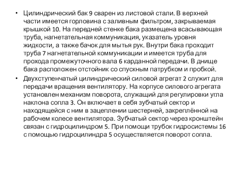 стенке бака размещена всасывающая труба, нагнетательная коммуникация, указатель уровня жидкости, а также бачок для мытья рук. Внутри бака проходит труба 7 нагнетательной коммуникации и имеется труба для прохода промежуточного вала 6 карданной передачи. В днище бака расположен отстойник со спускным патрубком и пробкой.