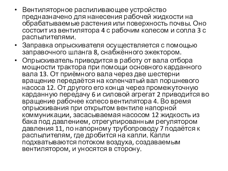 Слайд 31Вентиляторное распиливающее устройство предназначено для нанесения рабочей жидкости на обрабатываемые