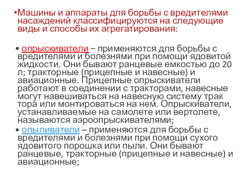 Слайд 2Машины и аппараты для борьбы с вредителями насаждений классифицируются на