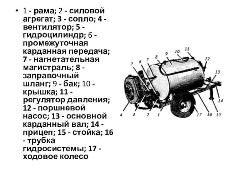 бак; 10 - крышка; 11 - регулятор давления; 12 - поршневой насос; 13 - основной карданный вал; 14 - прицеп; 15 - стойка; 16 - трубка гидросистемы; 17 - ходовое колесо