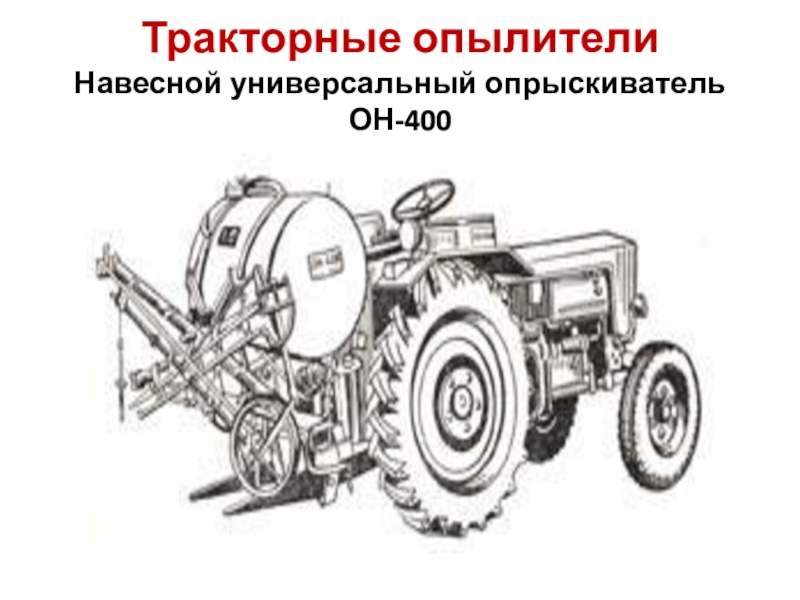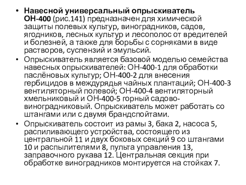 Слайд 24Навесной универсальный опрыскиватель ОН-400 (рис.141) предназначен для химической защиты полевых культур,