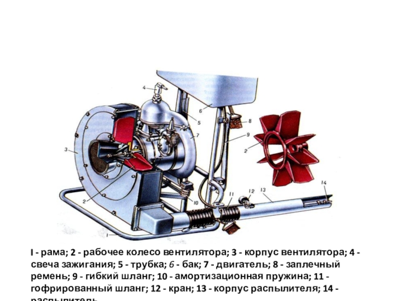 леса сплошной или выборочной обработкой объектов путём мелкокапельного опрыскивания масляными и водными растворами, суспензиями и эмульсиями химикатов. Опрыскиватель состоит из рамы 1, сваренной из трубок 5; центробежного вентилятора, состоящего из рабочего колеса 2 и корпуса 3; двигателя 7 с воспламенением горючей смеси от свечи зажигания 4; гибкого шланга 9 для подачи рабочей жидкости; гофрированного шланга 11 для подачи воздуха от вентилятора; бака 6 для раствора и приваренного к нему с задней стороны бензобака для обеспечения работы двигателя; шланга для создания избыточного давления в баке 6 и распылителя 14 для подачи рабочей жидкости в корпус распылителя 13.