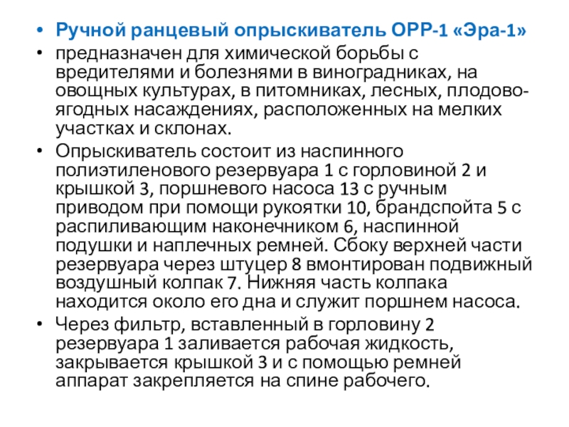 Слайд 16Ручной ранцевый опрыскиватель ОРР-1 «Эра-1»